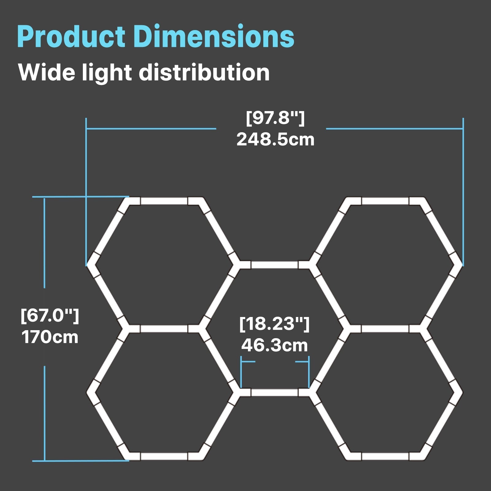 When choosing hexagon garage lights, considering the garage's ceiling size is crucial. Ensure the selected light dimensions fit the garage ceiling, excluding blocked areas when the garage door opens.Typically, a five-frame size is 97.8"x67.0''. You can also choose dimmable and warm/cool-toned lights based on lighting needs and personal preferences.