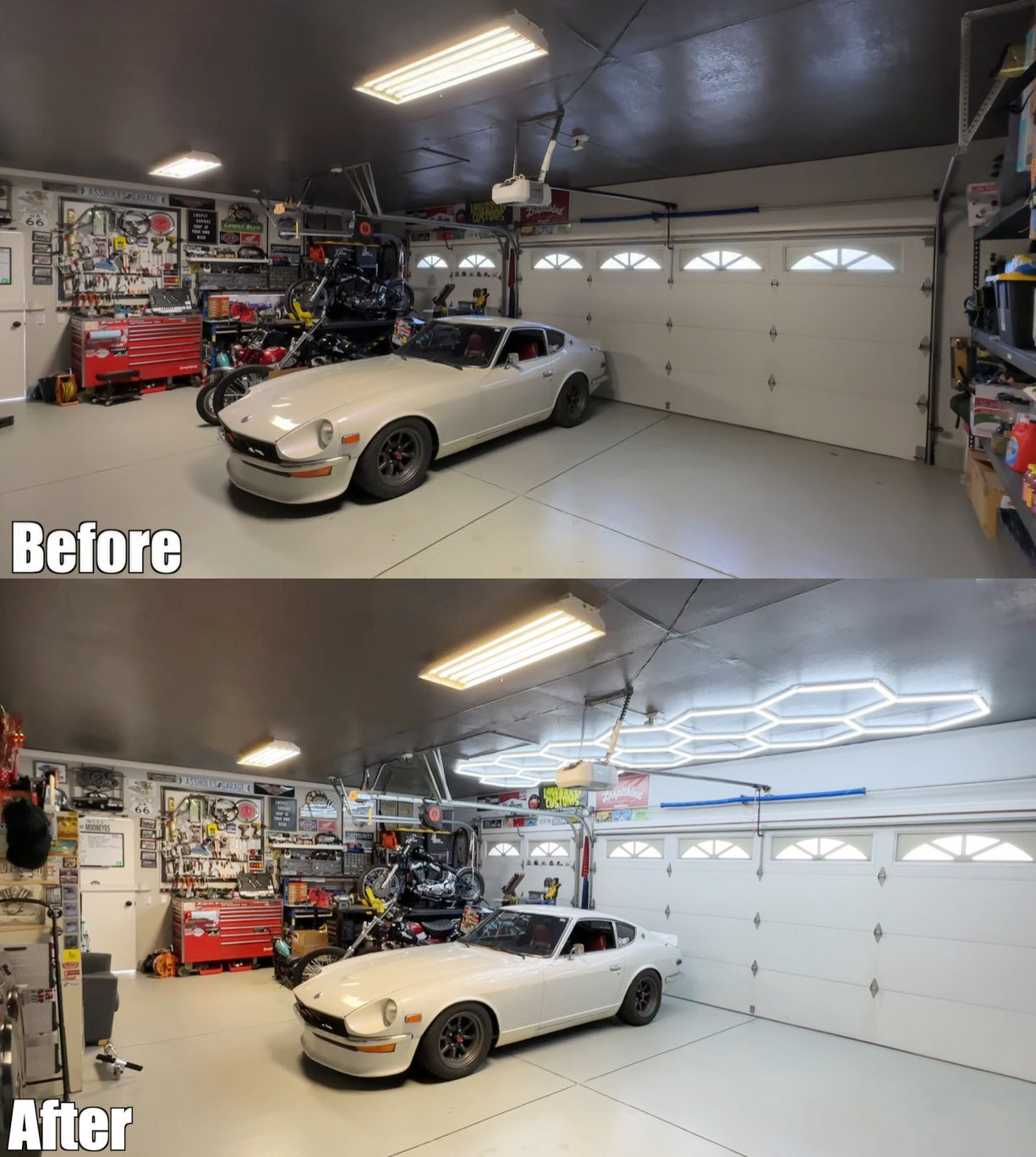 Here is an example of a YouTube creator DIYing their garage. Originally, the garage had only two dim yellow lights. Aftering installing hexagon garage lights and adjusting the lighting layout and tones, a touch of fashion was added, enhancing the garage's quality and making it more stylish. Through comparison photos, you can see how the application of lights improved the overall environment, bringing brightness and modernity to the garage.
