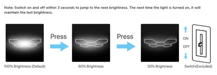 Hexagon LED Dimmable lights dimming is achieved by switching, there are three levels. Press the switch for a short time, turn it on and off for dimming.