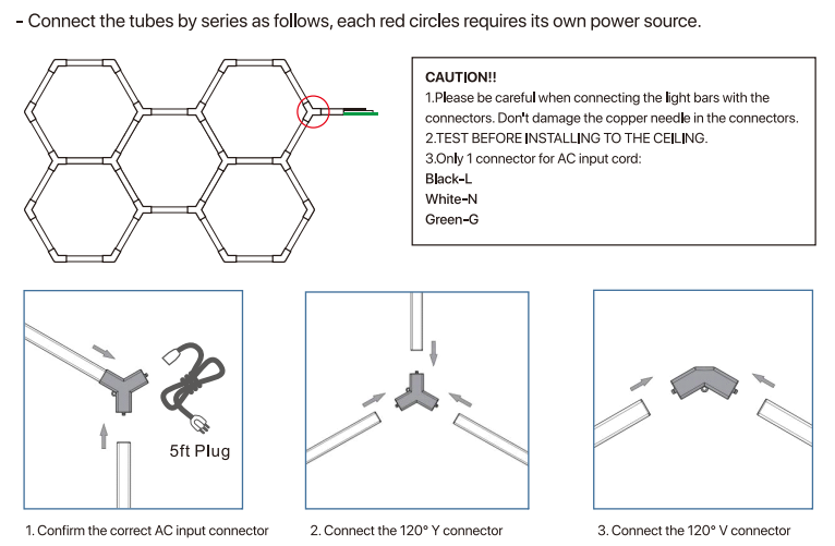 Connect the lighting tubes with V and Y connectiors, building each hexagon into a column to form the desired pattern. Make sure the AC output connectors are installed correctly. Each red circle requires its own power source.
